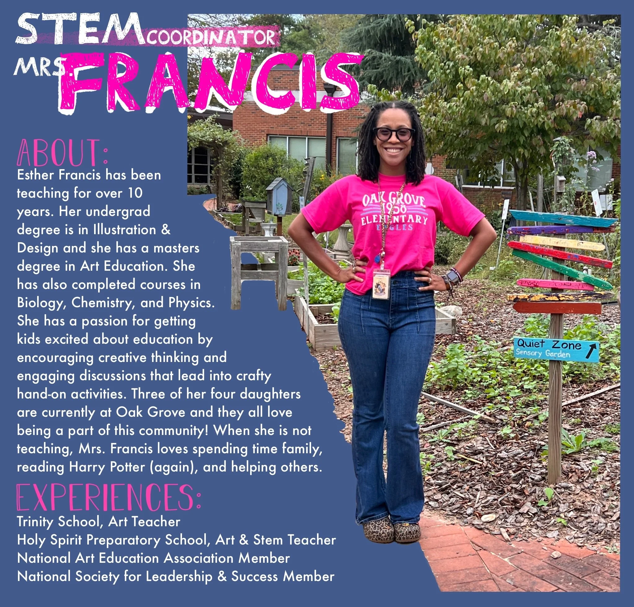 Esther Francis is our STEM Coordinator/Consultant (K-5).